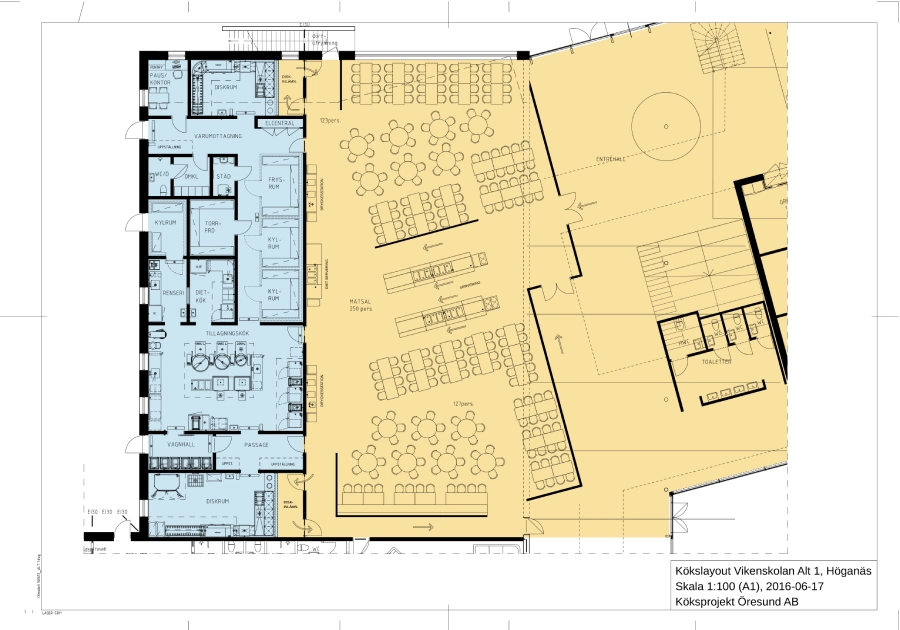 I samarbete med Arkitektlaget har vi ritat ett tillagningskök på Vikenskolan i Höganäs, planlösningen innehåller 2 st diskrum för att förenkla utflödet av elever. Antalet portioner är ca 1000 st, varav ca 250 st ska distribueras till andra enheter.
