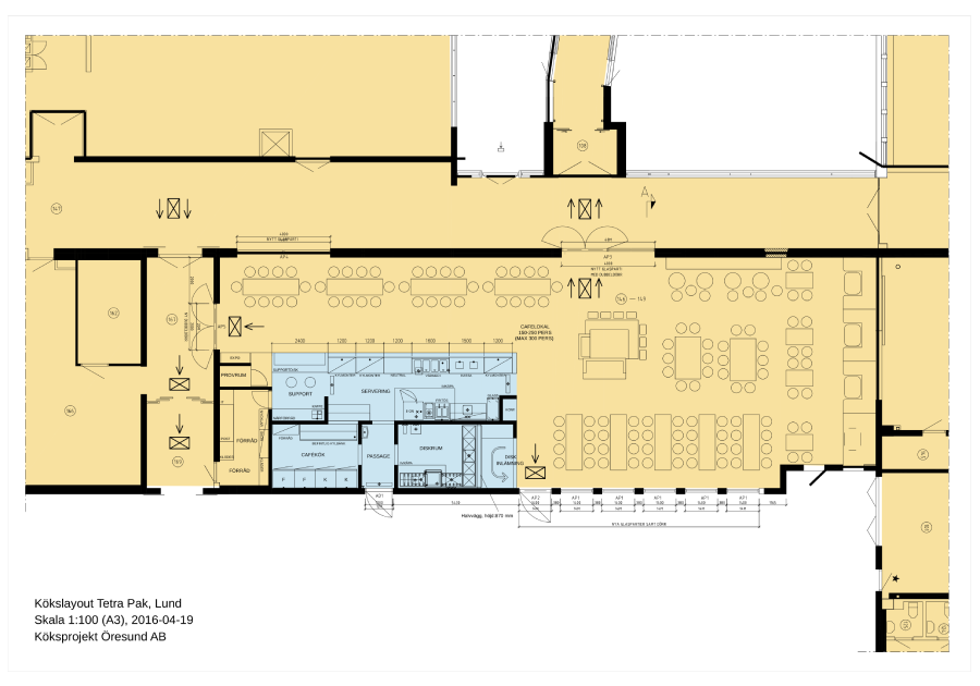 Tillsammans med Fojab Arkitekter har vi ritat ett bistrokök med kapacitet för ca 300 gäster. Detta kök ska vara ett komplement till den stora restaurangen, som redan finns i byggnaden.