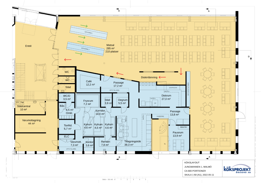 We have received an order from Svedab to design for a redevelopment of scullery and dining room as the number of portions increases. We will also improve the flows in the serving lines and ensure the working environment for the kitchen staff. We do this together with the department for service.