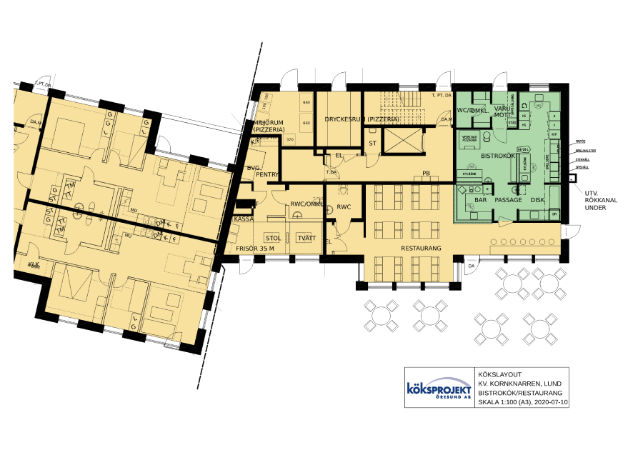 The property department has ordered design for the new preparation kitchen, dimensioned for 150 portions. The floor plan and concept are developed in collaboration with the department for service. The kitchen should be located in an extension to the existing unit.